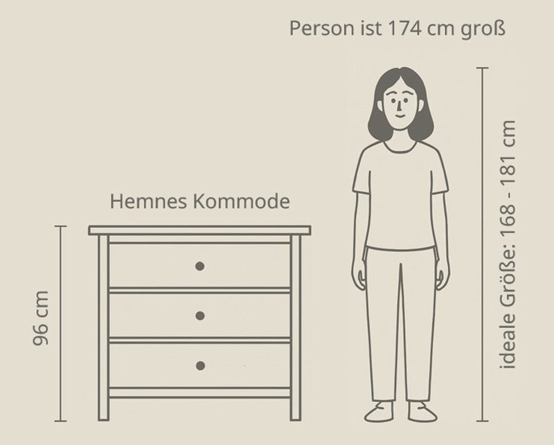 Mit einer Höhe von 96 cm hat die Hemnes Kommode die richtige Höhe, welche zu vielen Eltern, bzw. deren Körpergröße passt, um beim Wickeln eine entspannte Haltung einnehmen zu können.